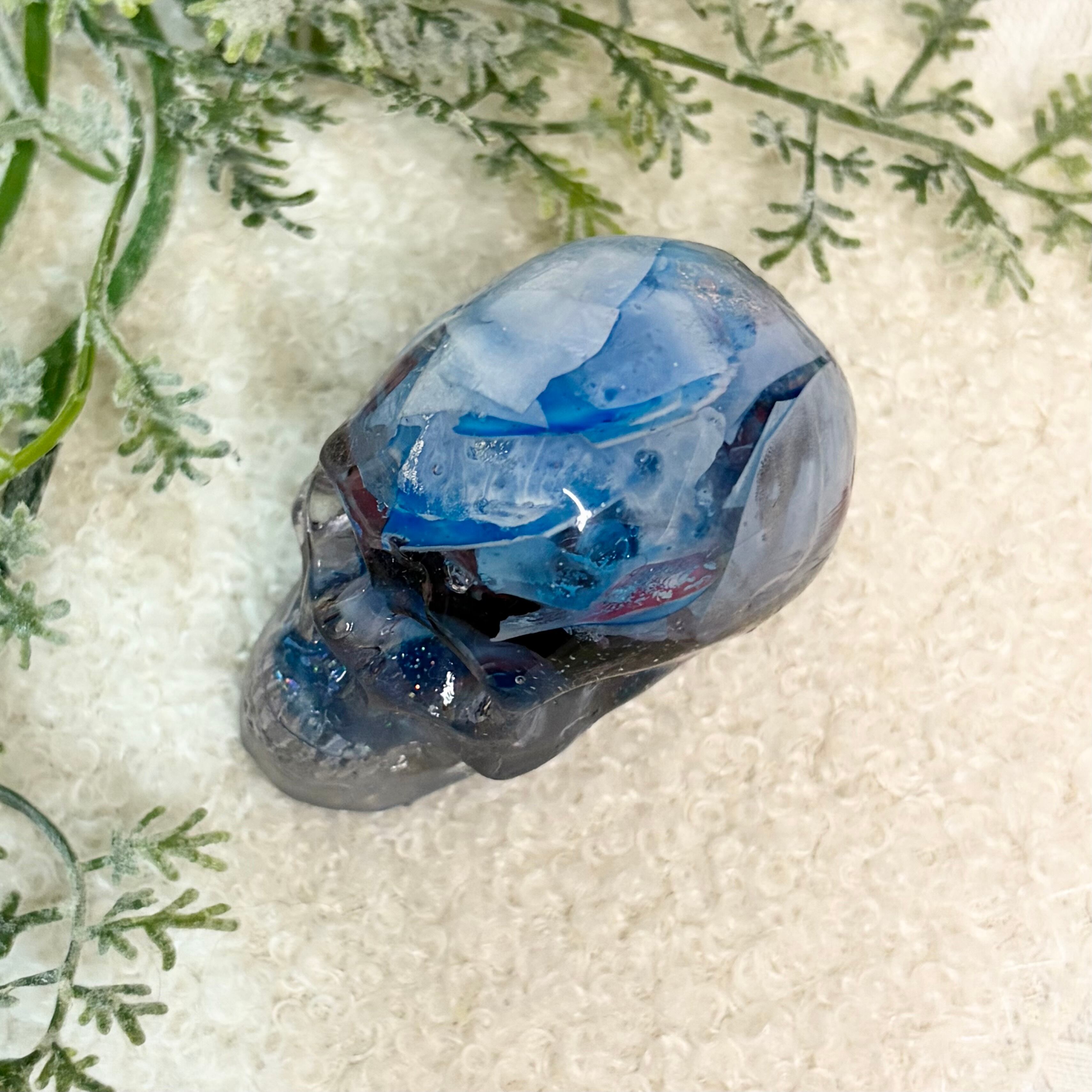 まるで氷や深海を閉じ込めたような、幻想的なスカル置物です。