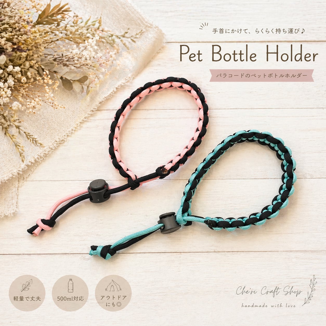 軽くて丈夫なパラコードを使用しているので、普段使いはもちろん、アウトドアやお散歩にもぴったり◎